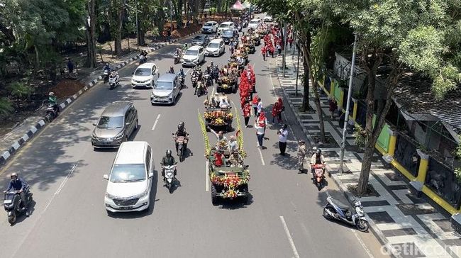 Wali Kota Eri Cahyadi beserta istri dan juga jajaran Pemkot Surabaya mengarak Piala Adipura Kencana dengan menggunakan mobil jip saat melintas di Jalan Wonokromo.