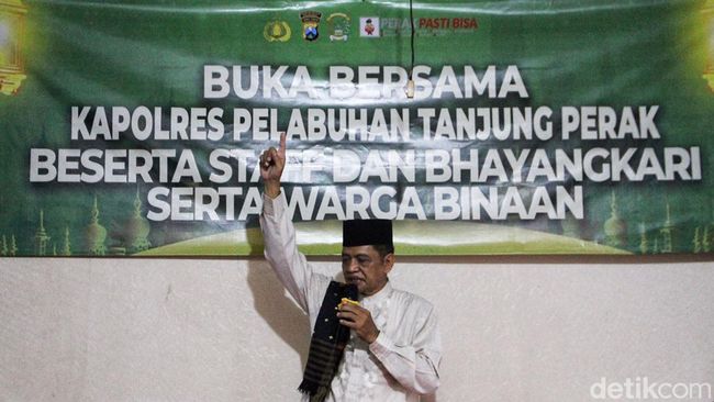 Surabaya - Polres Pelabuhan Tanjung Perak Surabaya menggelar buka bersama bersama puluhan para tahanannya. Mereka tampak melebur jadi satu dengan para petugas.