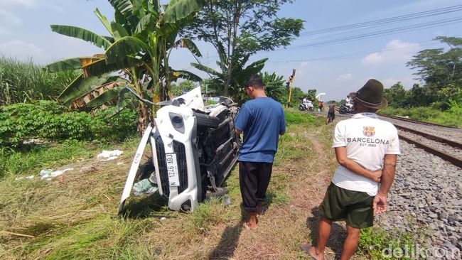 Sidoarjo - Mobil Daihatsu Ayla tertabrak kereta api Pasundan jurusan Madiun-Surabaya di perlintasan tanpa palang pintu di Desa Banjar Wungu, Kecamatan Tarik, Sidoarjo.