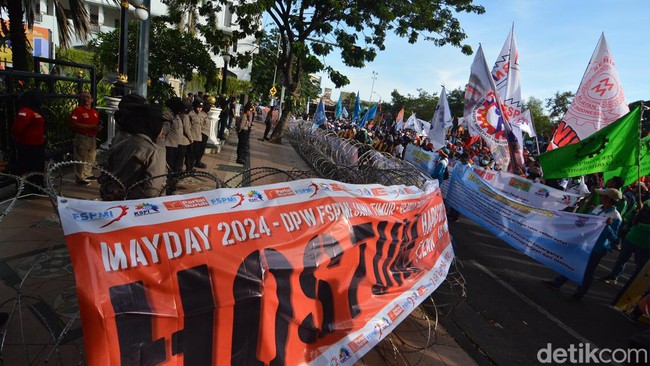 Surabaya - Ribuan buruh menggelar aksi turun ke jalan memperingati May Day atau Hari Buruh Sedunia 2024. Salah satu titik aksi adalah kantor Gubernur Jatim.