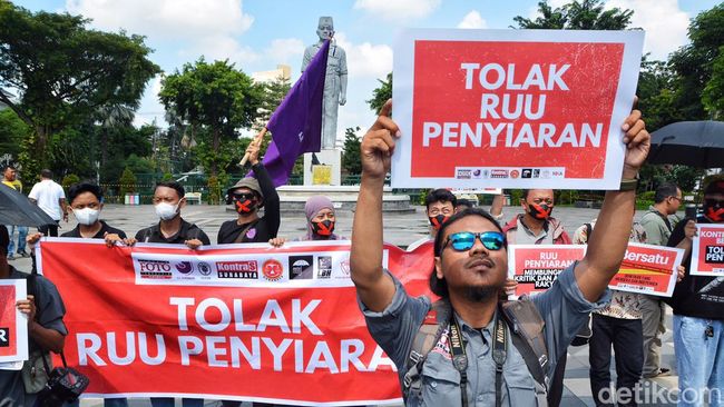 Surabaya - Puluhan massa tergabung dalam Koalisi Masyarakat dan Pers (Kompres) menggelar aksi di depan Grahadi, Surabaya. Massa menuntut penolakan RUU Penyiaran.