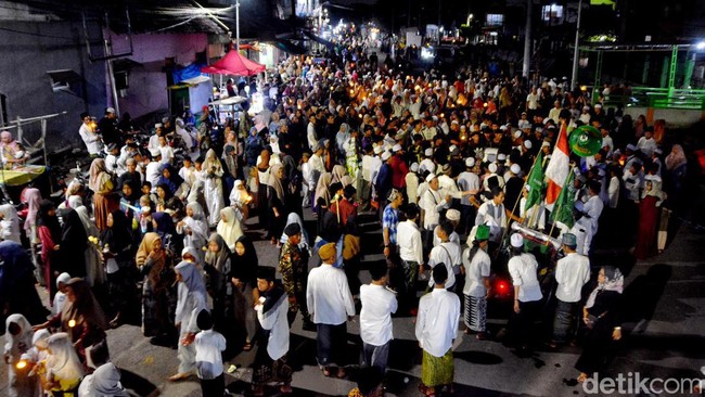 Surabaya - Ratusan warga Kedung Cowek, Surabaya menggelar takbir keliling menyambut hari raya Idul Adha. Uniknya, mereka menggunakan lampu LED sebagai pengganti obor.