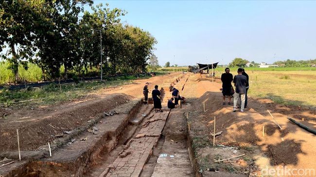 Mojokerto - Tim arkeolog menemukan struktur pagar kuno dari sebuah bangunan suci saat ekskavasi di Situs Bhre Kahuripan, Desa Klinterejo, Sooko, Mojokerto.