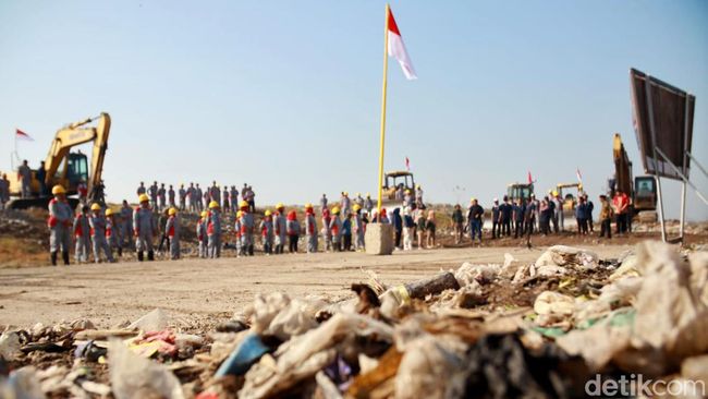 Sidoarjo - Puluhan pegawai Dinas Lingkungan Hidup dan Kebersihan (DLHK) dan pekerja pemilah sampah menggelar upacara HUT ke-79 RI di TPA di Sidoarjo, Sabtu (17/8/2024).