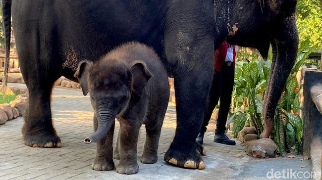 Surabaya - Kebun Binatang Surabaya akhirnya memperkenalkan anak gajah bernama Rocky Balboa kepada pengunjung. Anak gajah itu berusia 3 bulan.