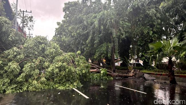 Surabaya - Sebuah pohon tumbang di Jalan Kertajaya hingga menutup jalan. Arus lalu lintas pun macet.