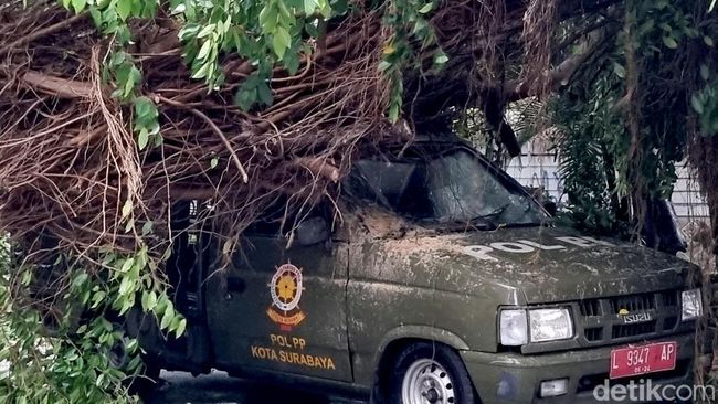 Dari pantauan detikJatim, satu unit mobil patroli Satpol PP Surabaya tertimpa pohon jenis beringin dengan lebar sekitar 5 meter di Jalan Ronggolawe.