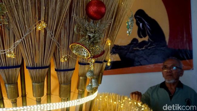 Jombang - Jemaat Gereja Kristen Jawi Wetan (GKJW) Jombang membuat pohon Natal unik berbahan sapu lidi. Pohon Natal itu setinggi 6 meter.