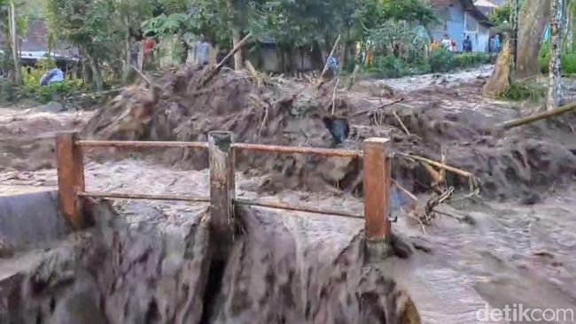 Bondowoso - Banjir bandang dari lereng Gunung Argopuro menerjang permukiman warga desa di Bondowoso. Banjir bandang membawa air bercampur lumpur dan material.