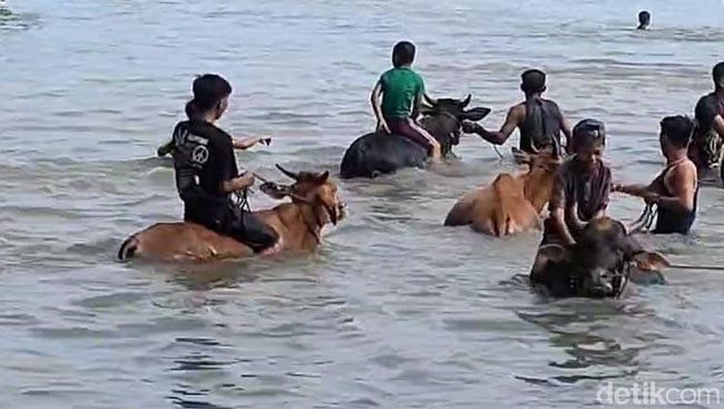 Gresik - Warga Desa Bululanjang, Kecamatan Sangkapura, Pulau Bawean, memiliki tradisi unik yang dilakukan setiap selesai musim tanam. Mereka memandikan sapi di pantai.