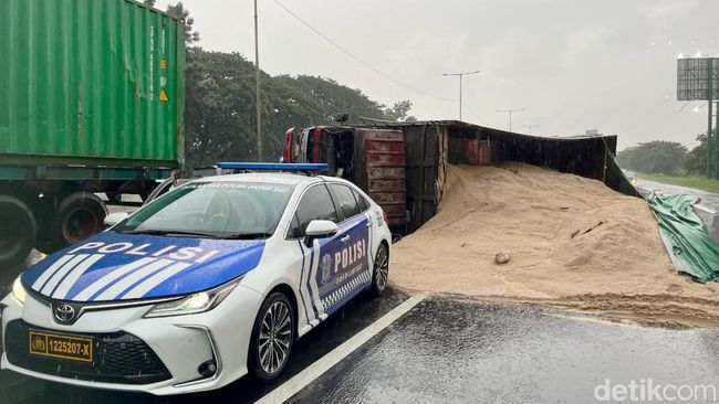 Surabaya - Sebuah truk muat jagung terguling di ruas Tol Dupak-Waru di depan Masjid Agung Surabaya (MAS). Muatannya berceceran di jalan hingga menyisakan satu jalur.