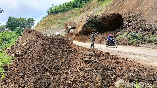 Lumajang - Longsor terjadi di jalur penghubung Lumajang-Malang di kilometer 57, Desa Sumberwuluh, Candipuro, Lumajang. Beruntung tidak ada korban jiwa dalam kejadian ini.