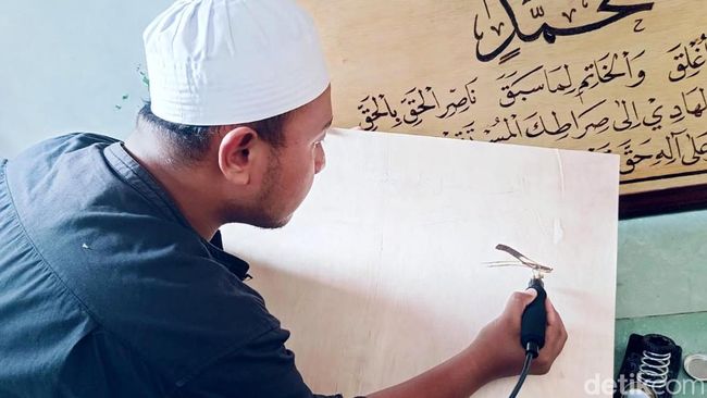 Lumajang - Pria asal Lumajang raup cuan jutaan rupiah dari karya seni. Dengan membuat kaligrafi teknik pyrography atau teknik bakar.