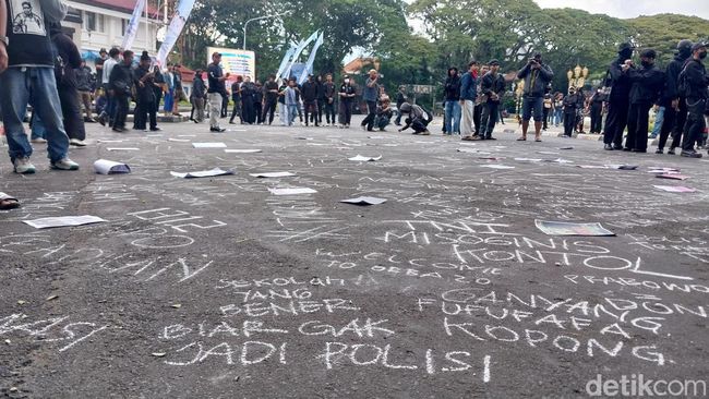 Kota Malang - Aksi demo menolak pengesahan Undang-Undang TNI di Kota Malang. Ratusan orang yang mengenakan kaus hitam berkumpul di depan Gedung DPRD Kota Malang.