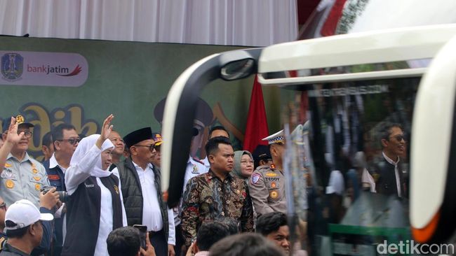 Surabaya - Gubernur Jawa Timur Khofifah Indar Parawansa melepas keberangkatan 'Mudik Gratis Pemprov Jatim 2025' dari Kantor Dishub Jatim. Diikuti sekitar 4.080 pemudik.
