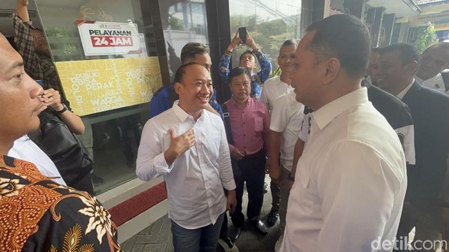 Jakarta - Wali Kota Surabaya Eri Cahyadi dampingi puluhan korban penahanan ijazah membuat laporan ke polisi. Laporan tersebut dilakukan di Polres Pelabuhan Tanjung Perak.