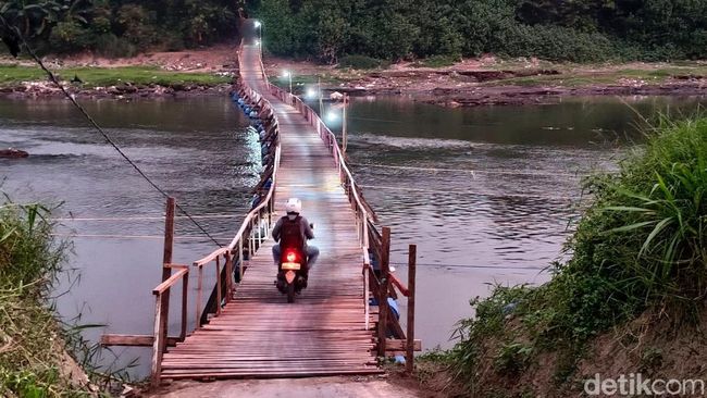 Sidoarjo - Sebuah jembatan apung membentang di atas Sungai Brantas di Desa Tambakrejo, Kecamatan Krembung, Kabupaten Sidoarjo. Jembatan ini menjadi akses vital warga.