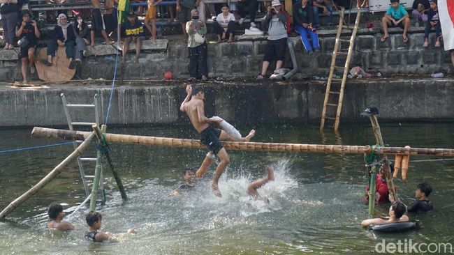 Surabaya - Puluhan peserta bertarung dalam lomba kepruk guling untuk memeriahkan momen Agustusan di Jogoloyo, Kelurahan Gunungsari, Surabaya. Acara berlangsung meriah.