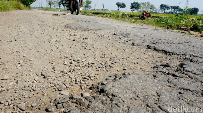 Jombang - Jalan penghubung Desa Keplaksari, Kecamatan Peterongan dengan Desa Rejosopinggir, Kecamatan Tembelang rusak. Jalan aspal selebar ini kondisinya rusak parah.