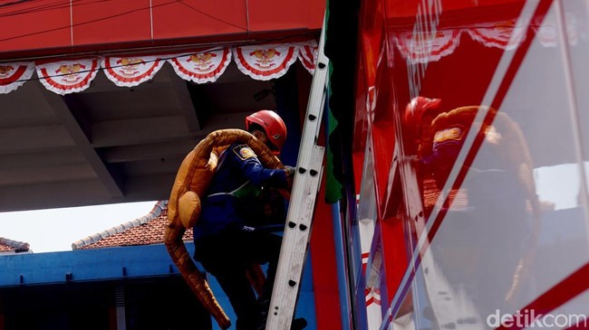 Surabaya - Petugas pemadam kebakaran (Damkar) Kota Surabaya mengikuti Surabaya Fighter Skill Competition di Mako Damkar Surabaya. Mereka beradu cepat dalam penyelamatan.