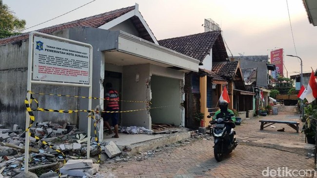 Surabaya - Kampung di tengah Jalan Ahmad Yani Surabaya mulai dibongkar. Pembongkaran dilakukan untuk rencana pembangunan fly over.