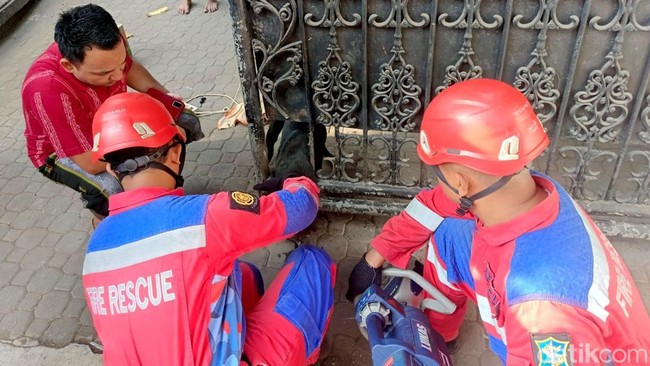 Surabaya - Tim rescue dari Dinas Pemadam Kebakaran dan Penyelamatan (DPKP) Kota Surabaya mengevakuasi anjing terjepit pagar. Anjing itu akhirnya bisa diselamatkan.