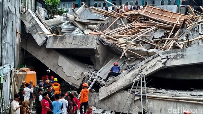 Sidoarjo - Bangunan yang ambruk di asrama putra Pondok Pesantren Al Khoziny di Desa Buduran, Sidoarjo. Saat ini petugas masih melakukan proses evakuasi korban.