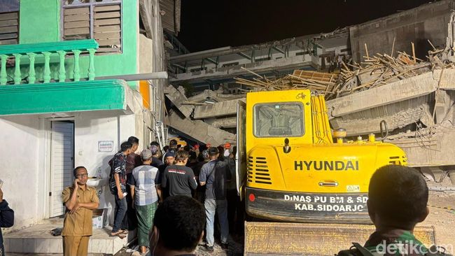 Sidoarjo - Alat berat berupa ekskavator dari Dinas PU BM & SDA Kabupaten Sidoarjo diterjunkan di lokasi bangunan musala Ponpes Al Khoziny Buduran, Sidoarjo yang ambruk.