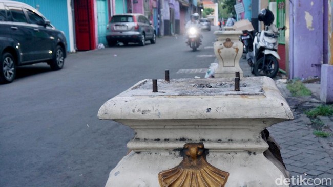 Surabaya - Sejumlah plat penyangga lampu hias dikawasan Kota Lama Surabaya hilang. Plat berbentuk persegi dari besi itu raib diduga dicuri.