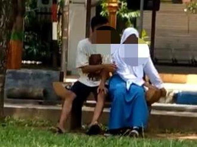 Si pria mengenakan kaus putih dan celana pendek hitam. Yang perempuan tampak duduk di sebelah kiri pria. Remaja putri tersebut masih mengenakan seragam sekolah.