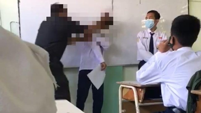 Video seorang guru pukul siswa SMP di Surabaya, viral. Video yang viral di grup Whataspp berdurasi 3 detik itu tampak guru memukul kepala siswa yang berdiri di depan kelas.