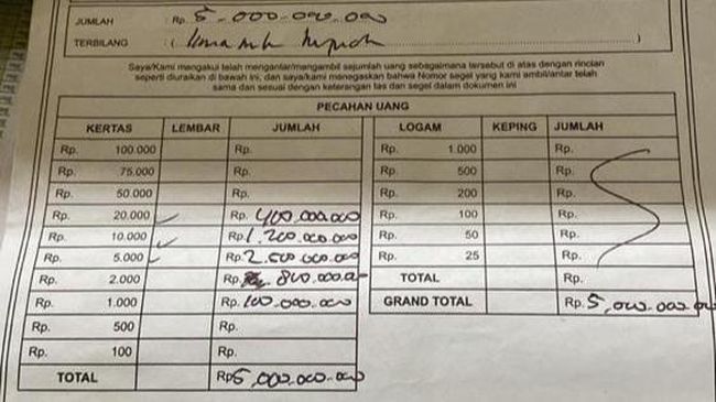 Tanda terima ini juga menunjukkan rincian pecahan uang baru berjumlah fantastis tersebut. Yaitu Rp 400 juta berupa pecahan Rp 20.000, Rp 1,2 miliar pecahan Rp 10.000, Rp 2,5 miliar pecahan Rp 5.000, Rp 800 juta pecahan Rp 2.000, serta Rp 100 juta berupa pecahan Rp 1.000.