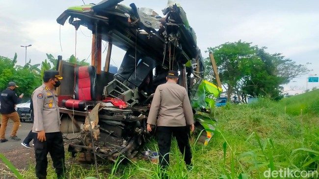 Akibatnya, bus berpenumpang 32 orang itu menabrak besi pembatas jalan tol, lalu menabrak fondasi tiang VMS. Kerasnya benturan membuat bagian depan sisi kiri bus ini hancur. Bus juga terguling ke kanan di lajur kiri jalan tol. Sedangkan tiang VMS ambruk beserta fondasinya.