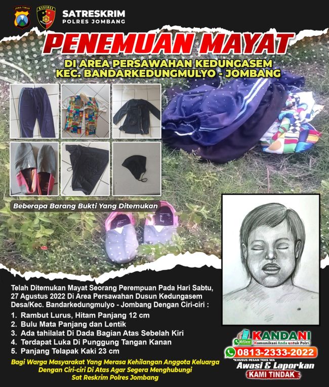 Polisi menyebarkan sketsa wajah gadis yang ditemukan tewas bugil di kebun tebu Dusun Kedungasem, Desa/Kecamatan Bandar Kedungmulyo. Tahi lalat di dada atas sebelah kiri menjadi salah satu ciri-ciri fisik khusus korban.