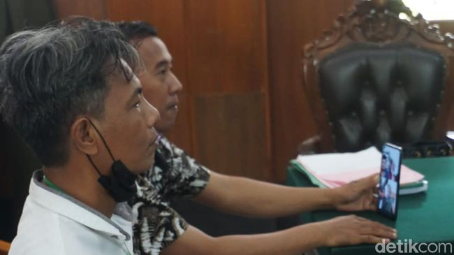 Terdakwa Moch Aliman Alias Mat Becak Bin Alm Sinal menjalani sidang perdana perkara yang menjeratnya di Ruang Tirta Pengadilan Negeri Surabaya secara daring dari tempat lain. Pria ini nekat