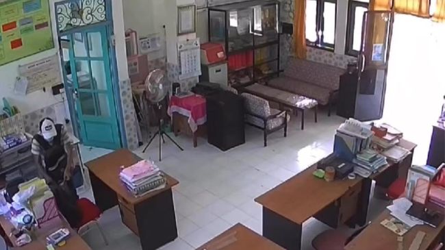 Setelah masuk, pria bertopi itu sempat clingak-clinguk melihat situasi sekitar. Setelah dirasa aman, pria tersebut mulai menggeledah beberapa meja guru.