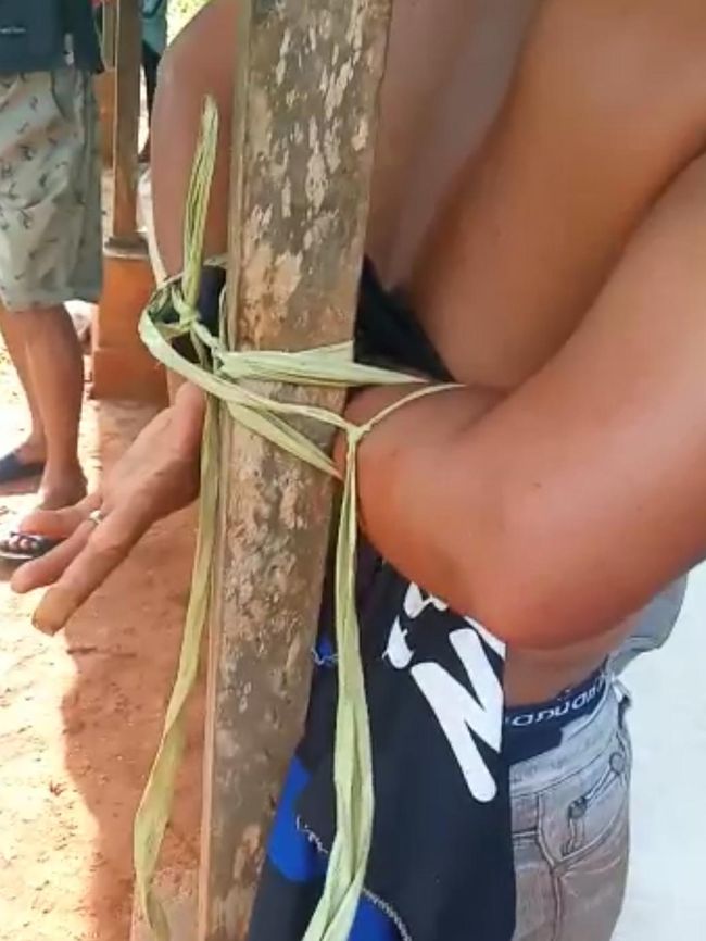 Peristiwa itu terekam dalam sebuah video amatir yang viral di media sosial. Terlihat dalam video tersebut, si pencuri tak memakai baju. Dia hanya memakai celana jeans dengan kondisi tangan diikat ke tiang dengan seutas tali rafia.