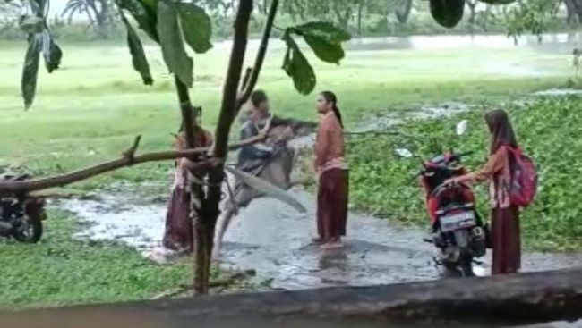 Di tengah cekcok, siswa yang memakai jas hujan tiba-tiba melayangkan pukulan kepada siswi berseragam Pramuka. Dia lalu menendang siswi tersebut hingga tersungkur.
