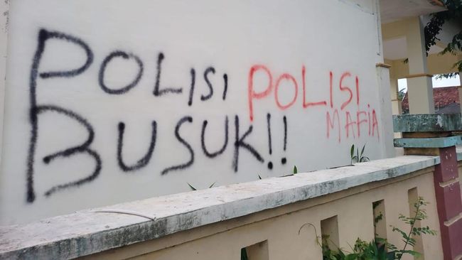 Seperti tulisan 'polisi asu', 'polisi busuk', dan 'polisi mafia'. Namun sederet tulisan tersebut sudah dihapus pada Jumat (3/2/2023).