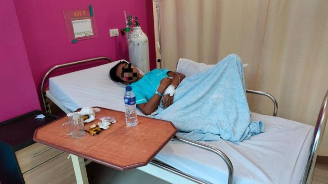 Dalam foto yang diterima detikSumut, tampak OG sedang berbaring di bed rumah sakit. OG terlihat sedang tertidur karena matanya terpejam saat difoto. Sedangkan di tangan kirinya ada selang infus yang masih terpasang.