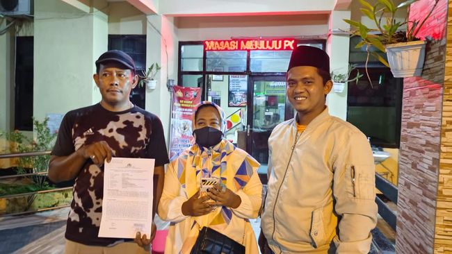 Andi Setiawan (43) melapor ke Polsek Prajurit Kulon, Kota Mojokerto pada Sabtu (11/3) malam. Ia melapor ditemani istrinya, Ince Tus Ikawati dan Ketua Pagar Nusa Kota Mojokerto Arif Wahyudi.