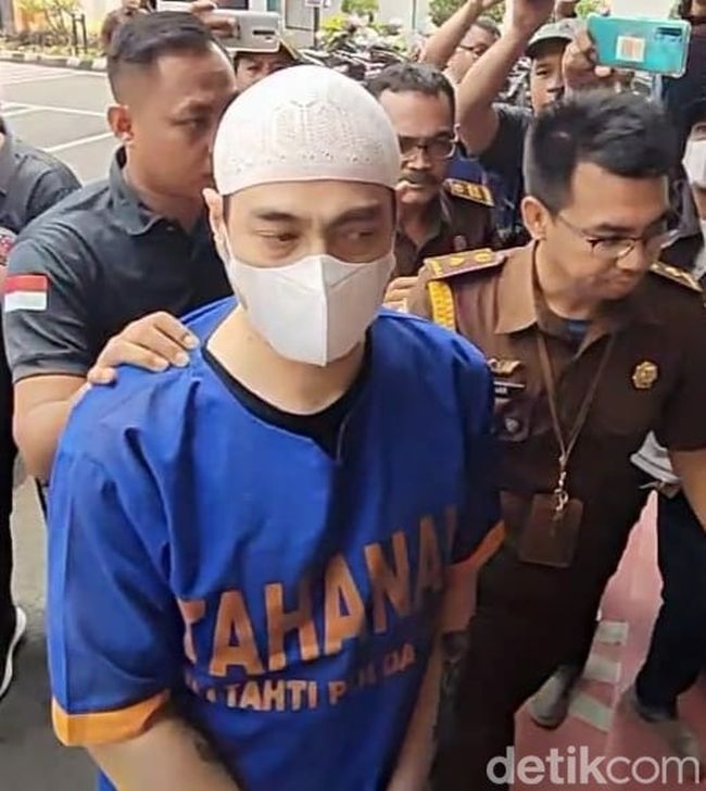Ferry Irawan yang memakai peci putih dan diborgol dengan tali plastik cable ties warna putih, terkadang tertunduk saat digiring polisi dan tim kejaksaan.