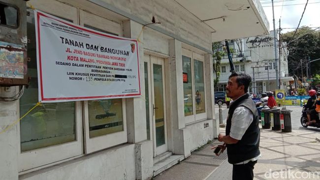 Dari pantauan di lokasi, sebuah banner dipasang depan tembok bangunan bertuliskan 'Tanah dan Bangunan Jalan Jenderal Basuki Rahmat No 81-83 Kota Malang Sedang Dalam Penyitaan Penyidik Bareskrim Polri Berdasarkan Ijin Khusus Penyitaan Dari PN Malang No 199/PENPID.B-SITA/2023/PN Malang'.
