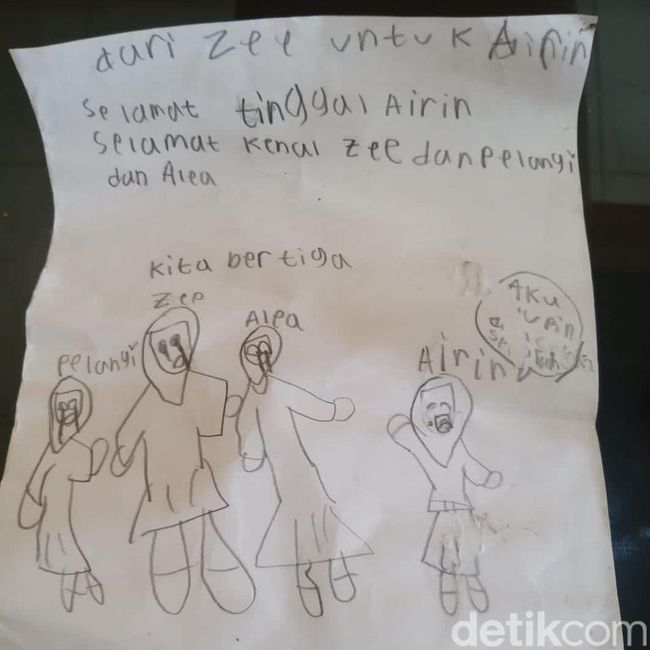 Dari gambar tangan yang dilihat detikJatim, tampak tiga anak menggandeng tangan dan menangis. Di atas gambar tersebut terdapat tulisan 'dari Zee untuk Airin'. Tampak di secarik kertas AZ menggambarkan 4 sosok dirinya bersama tiga orang temannya yang masing-masing diberi nama.