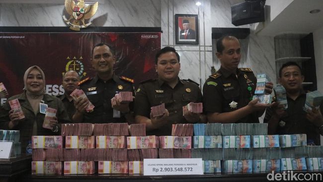 "Total uang yang didapatkan dari proses lelang tersebut Rp 2.903.573.572 dari total uang pengganti kewajiban Maskur sebesar Rp 44 miliar lebih," kata Firdaus saat jumpa pers di kantornya, Jalan KH Wahid Hasyim, Senin (29/5/2023).