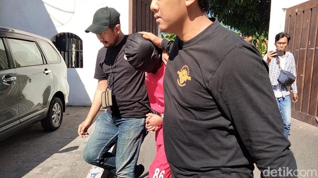 Hari ini, R dihadirkan di Polrestabes Surabaya. Ia mengenakan baju tahanan, sementara tangannya diikat ke depan dengan kabel ties. Namun, tampang R tertutup oleh topeng hitam yang dikenakannya.