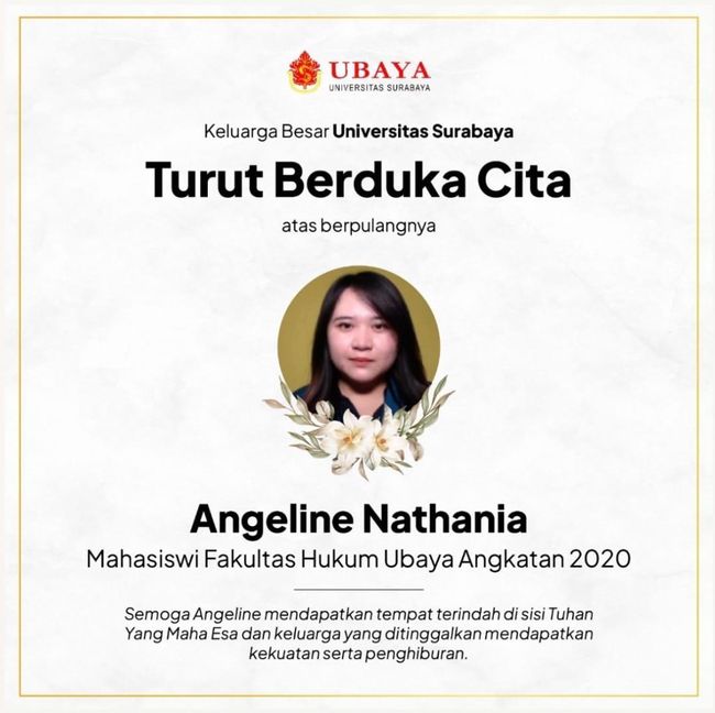 Angeline Nathania atau AN, wanita yang tewas dibunuh guru les musik hingga jasadnya dimasukkan ke dalam koper, berstatus sebagai mahasiswi Universitas Surabaya (Ubaya). Seluruh sivitas akademika Ubaya menyampaikan dukacita yang mendalam atas meninggalnya AN.