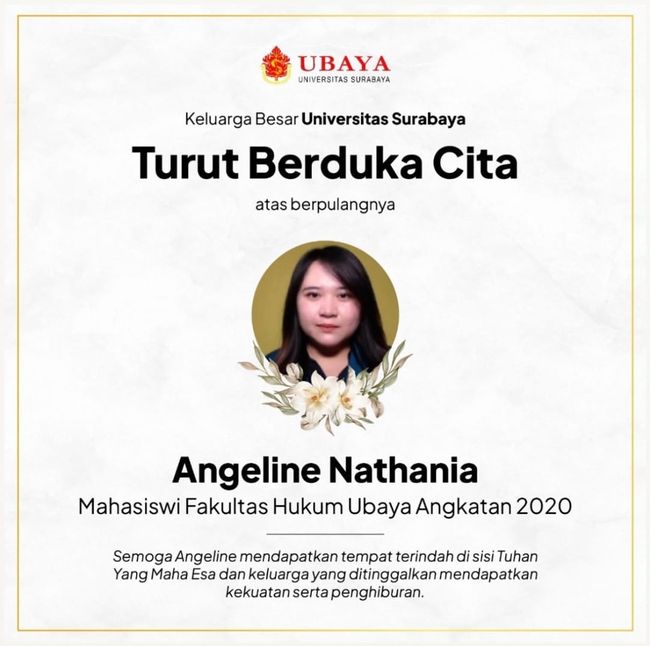 Mahasiswi Fakultas Hukum Universitas Surabaya (Ubaya), Angeline Nathania atau AN, dibunuh oleh guru les musiknya berinisial R. AN tewas dicekik lalu jasadnya dimasukkan ke dalam koper hingga akhirnya dibuang ke jurang Gajah Mungkur, Pacet, Mojokerto.