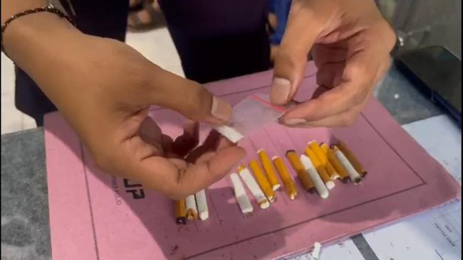 Saat proses pemeriksaan barang kiriman, petugas mencurigai benda aneh yang ada di dalam batang rokok. Petugas akhirnya melakukan pembongkaran dua bungkus rokok yang hendak dikirim.