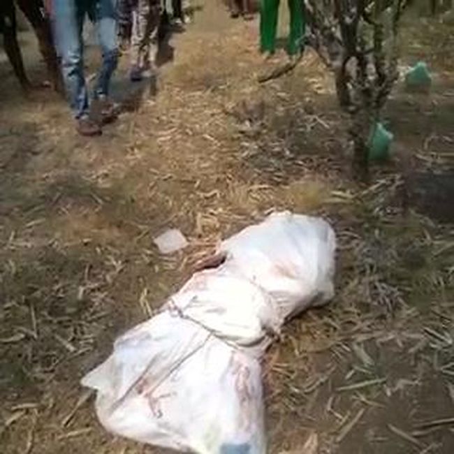 Saat ditemukan mayat terbungkus karung beras. Mayat ini ditemukan di tengah pemakaman umum setempat.
